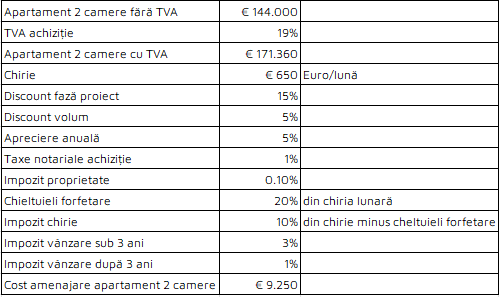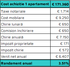 De exemplu, pentru un apartament cu două camere achiziționat la prețul de 171.300 Euro și închiriat cu 650 Euro pe lună, randamentul anual este de aproximativ 4%, fără a include eventualele perioade în care apartamentul nu este închiriat.