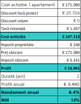 Un aspect important de avut în vedere este că, dacă revânzarea are loc în mai puțin de 3 ani de la achiziție, se aplică un impozit de 3% din prețul de vânzare, ceea ce poate influența randamentul final al investiției.