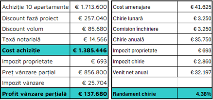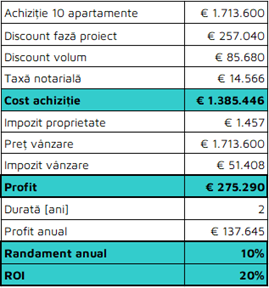 Concret, se analizează vânzarea a 5 apartamente, din cele 10 achiziționate, imediat ce proiectul este complet, în timp ce celelalte 5 apartamente sunt păstrate timp de 5 ani. Pe parcursul acestei perioade, se estimează o creștere anuală a prețurilor de 5%. De asemenea, în timpul celor 5 ani de deținere, apartamentele vor fi închiriate, ceea ce implică o investiție suplimentară pentru mobilarea acestora, dar și un venit adițional din chirii.