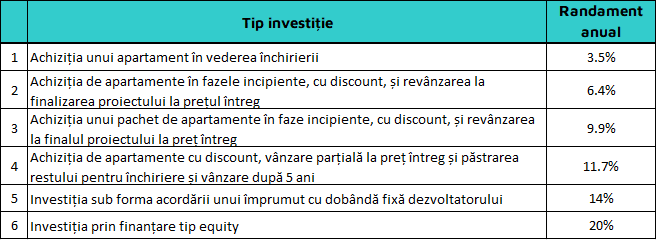 - Achiziția de apartamente în fazele incipiente, cu discount, și revânzarea la finalizarea proiectului la prețul întreg – investiția în apartamente aflate în faza de construcție, la preț redus, urmând ca acestea să fie vândute la prețul de piață la final.