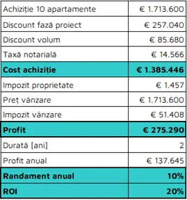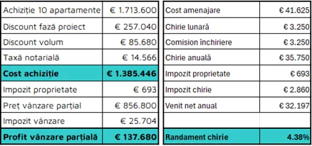 Concret, se analizează vânzarea a 5 apartamente, din cele 10 achiziționate, imediat ce proiectul este complet, în timp ce celelalte 5 apartamente sunt păstrate timp de 5 ani. Pe parcursul acestei perioade, se estimează o creștere anuală a prețurilor de 5%. De asemenea, în timpul celor 5 ani de deținere, apartamentele vor fi închiriate, ceea ce implică o investiție suplimentară pentru mobilarea acestora, dar și un venit adițional din chirii.