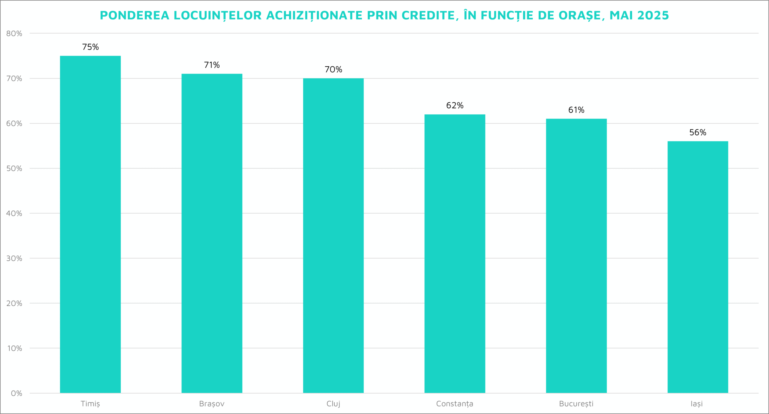 Pe locul doi în topul județelor cu cea mai mare pondere a achizițiilor finanțate prin credit se află Brașovul, cu 71%, urmat îndeaproape de județul Cluj, aflat pe poziția a treia. La polul opus, cea mai mare pondere a tranzacțiilor realizate cu bani cash se înregistrează în județul Iași, unde 44% dintre locuințe au fost cumpărate fără finanțare bancară.