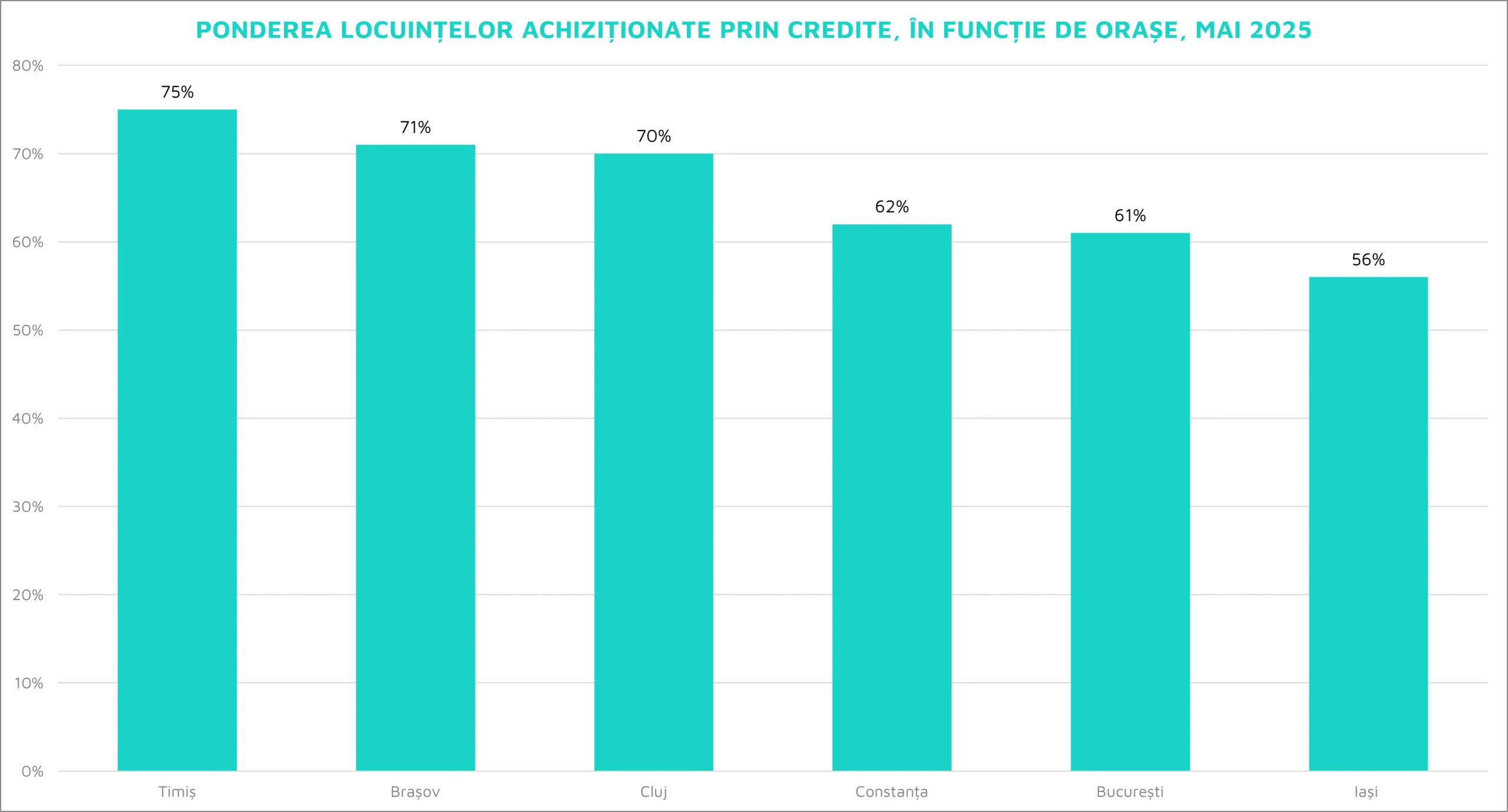 Pe locul doi în topul județelor cu cea mai mare pondere a achizițiilor finanțate prin credit se află Brașovul, cu 71%, urmat îndeaproape de județul Cluj, aflat pe poziția a treia. La polul opus, cea mai mare pondere a tranzacțiilor realizate cu bani cash se înregistrează în județul Iași, unde 44% dintre locuințe au fost cumpărate fără finanțare bancară.