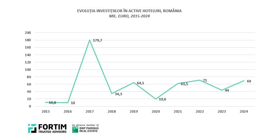 „România se încadrează în trendul european de diversificare a investițiilor în clase de active comerciale, un mare câștigător fiind sectorul de proprietăți hoteliere. În 2024, s-a încheiat și cea mai mare tranzacție din ultimii 3 ani, prin achiziția de către austriecii de la Julius Meinl a Hotelului Ambasador din București. În ultimii trei ani, în România investitorii au cumpărat 19 hoteluri, în valoare totală de 179,95 milioane de euro, din care zece hoteluri sunt situate în stațiuni montane și de pe litoral, cu o valoare totală de 71 milioane euro, ceea ce reprezintă 39% din valoarea totală a investițiilor în spații de cazare”, a declarat Ștefan Oană, Head of Capital Markets la Fortim Trusted Advisors, membră în Alianța BNP Paribas Real Estate.