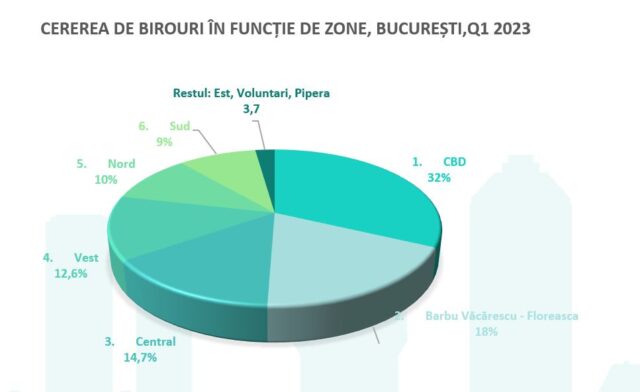 În premieră, zona CBD (Central Business District), din jurul Pieței Victoriei, este pe primul loc în topul zonelor cu suprafața cea mai mare de spații închiriate din București, cu o cotă de piață de 32% din total. Piața închirierilor a fost de partea chiriașilor, în primele trei luni din 2023 și acest lucru s-a văzut în faptul că au ales cele mai bune zone, cu cele mai multe facilități.