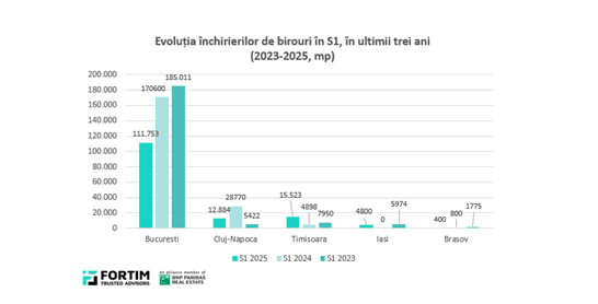 Capitala rămâne cea mai importantă piață de birouri din România, dar aceasta a înregistrat și cel mai accentuat declin al cererii. În primele șase luni ale anului 2025, în București au fost închiriați 111.753 mp de spații de birouri, ceea ce reprezintă 76,8% din totalul tranzacțiilor realizate în principalele centre de afaceri din țară, potrivit unui raport al Fortim Trusted Advisors, membră în Alianța BNP Paribas Real Estate.