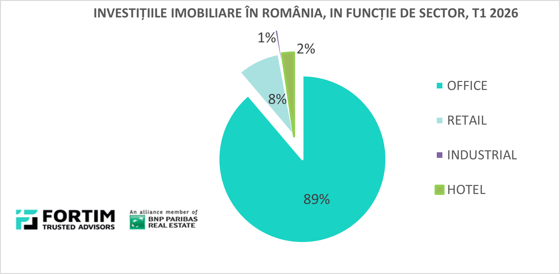 Piața investițiilor imobiliare din România a înregistrat un volum total de aproximativ 152 milioane de euro în primul trimestru din 2026, într-un context caracterizat de prudență din partea investitorilor și de o activitate selectivă, conform unui bilanț realizat de către Fortim Trusted Advisors, membră în alianța BNP Paribas Real Estate. Sectorul de birouri a dominat clar piața, concentrând 89% din volumul total tranzacționat.