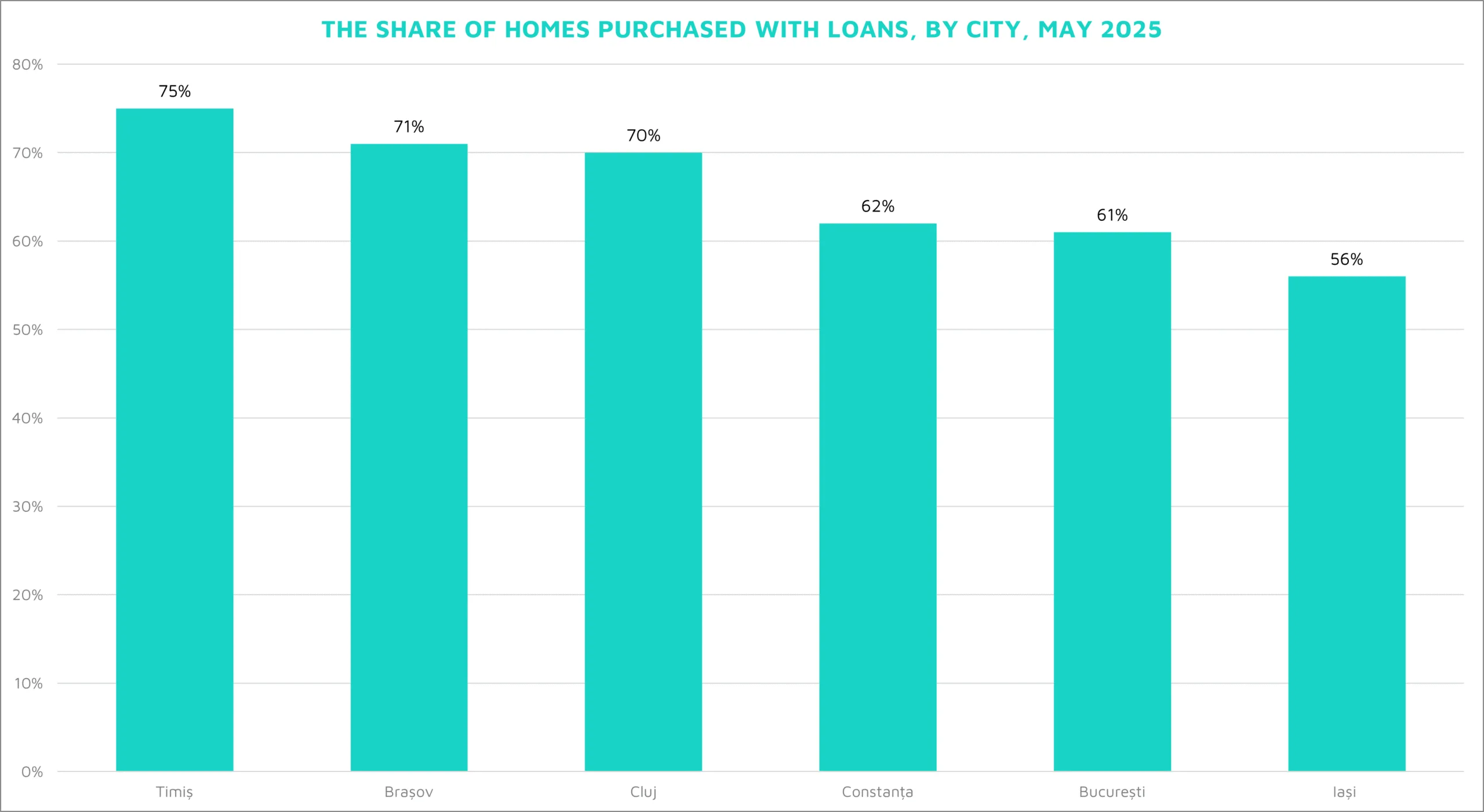 Second place in the ranking of counties with the highest proportion of loan-financed purchases goes to Brasov, with 71%, closely followed by Cluj County in third place. Conversely, Iasi County has the highest proportion of cash-only transactions, with 44% of home purchases being made without bank financing.